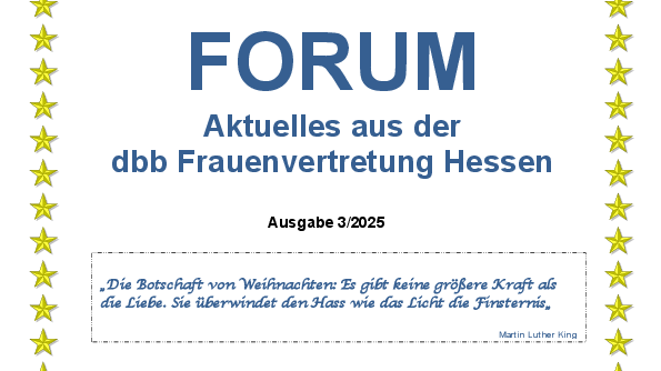 In dieser Ausgabe lesen Sie: • Rückblick auf den Landesfrauentag 2025 der dbb Frauenvertretung Hessen • Gender Pay Gap • dbb Bundesfrauenkongress 2026