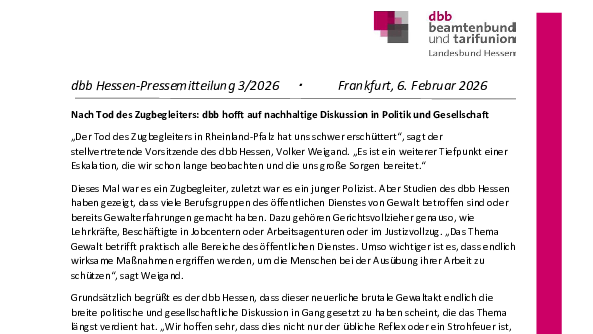 „Der Tod des Zugbegleiters in Rheinland-Pfalz hat uns schwer erschüttert“, sagt der stellvertretende Vorsitzende des dbb Hessen, Volker Weigand. „Es ist ein weiterer Tiefpunkt einer Eskalation, die wir schon lange beobachten und die uns große Sorgen bereitet.“